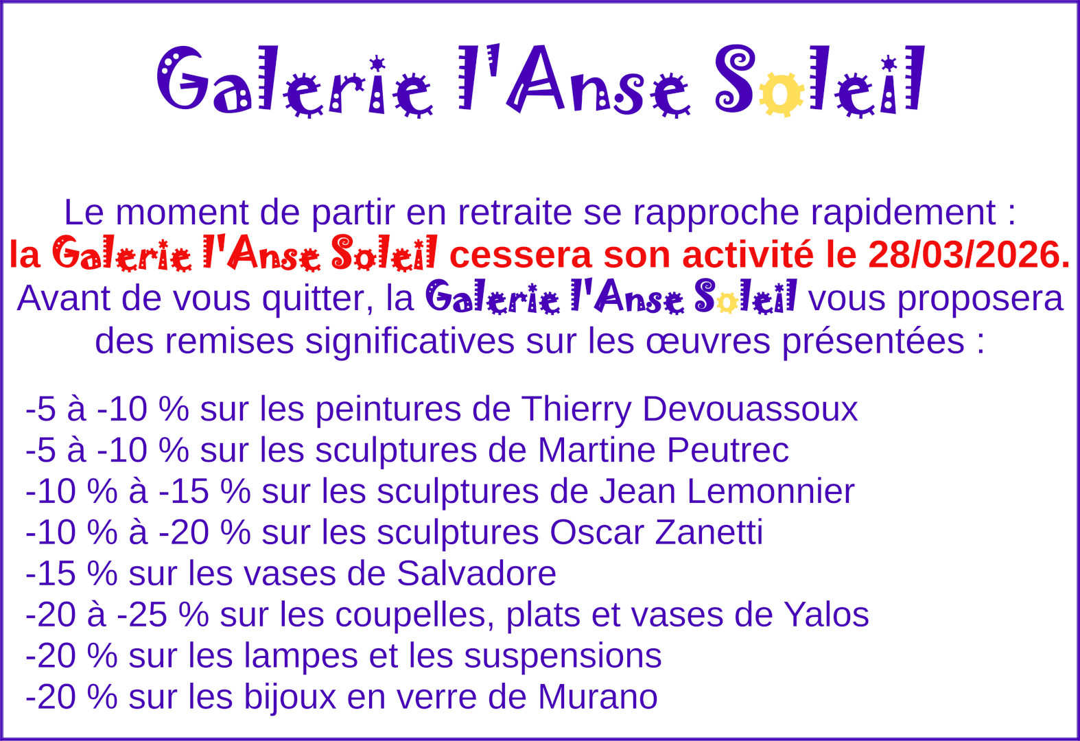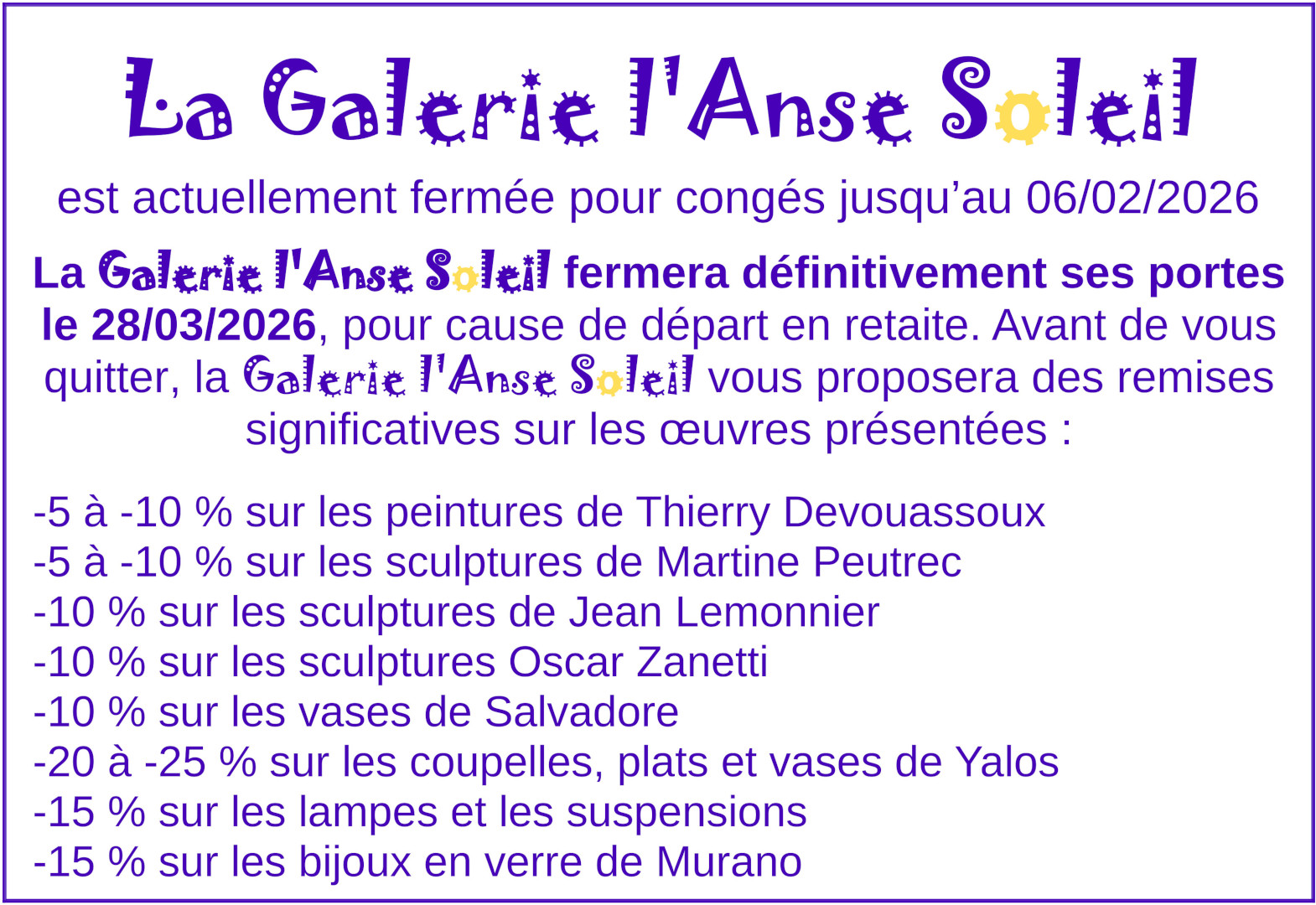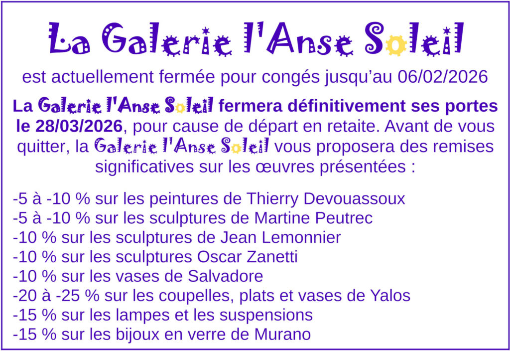 Le site vous permet de découvrir les œuvres d’art de la galerie l’Anse Soleil et d’obtenir les prix de vente ou toute information complémentaire en faisant une demande dans l’onglet Contacts