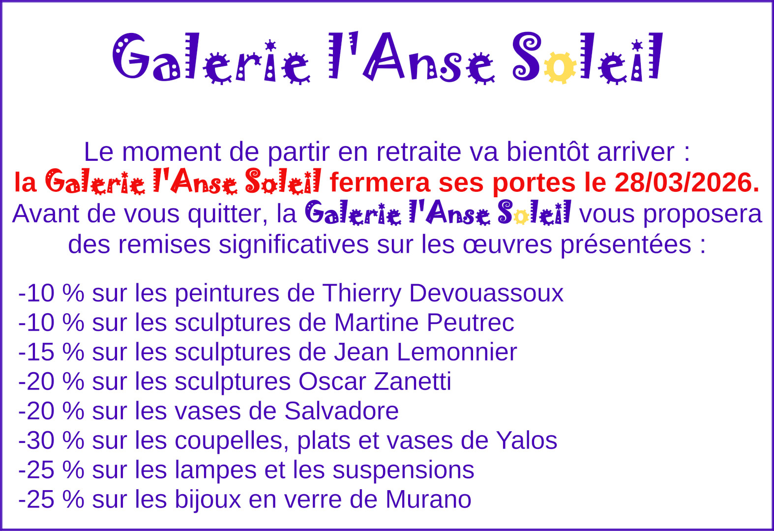 - La galerie l’Anse Soleil vous propose une livraison dans un rayon de 40 km et une expédition en colissimo.